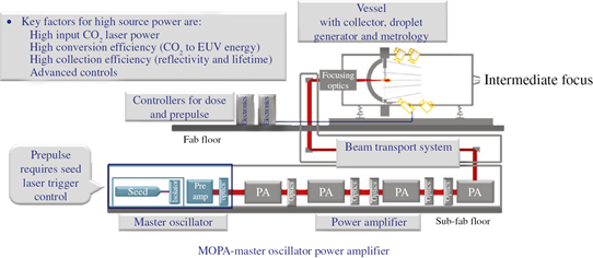 EUV光源如下圖所示。LPP光源由幾個(gè)主要組件組成:(i)由主振蕩器和功率放大器(MOPA)組成的高功率CO2激光器,(ii)光束傳輸系統(tǒng)(BTS),包括聚焦和光束位置控制;(iii)裝有液滴發(fā)生器,收集器和計(jì)量模塊的真空容器。CO2激光聚焦在微滴發(fā)生器輸送的錫微滴上。激光等離子體相互作用發(fā)生在橢圓形收集鏡的主要焦點(diǎn)處,激光液滴對(duì)準(zhǔn)是通過(guò)光學(xué)計(jì)量模塊和傳感器進(jìn)行測(cè)量的,傳感器提供反饋以保持同步和最佳性能。橢圓鏡透射從等離子體收集的EUV光,并將其通過(guò)中間聚焦孔重定向到掃描儀的照明光學(xué)器件。
